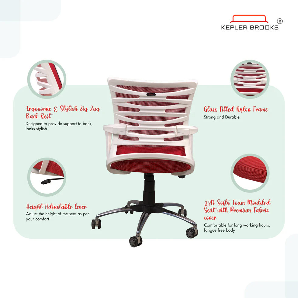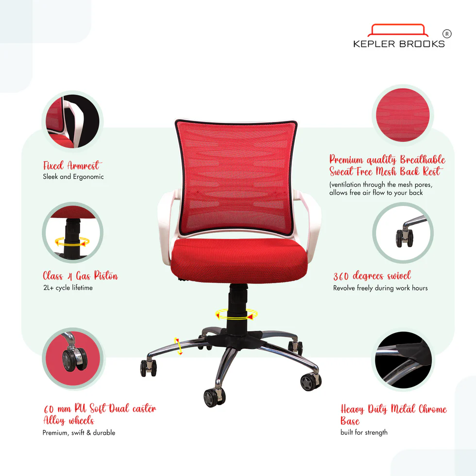 Internal frame material: Nylon & Glass Fibre | Upholstery cover: Breathable Mesh | Seat Upholstery : 45D High Density Foam | Size: Mid Back | Chrome Base | Class 4 Piston