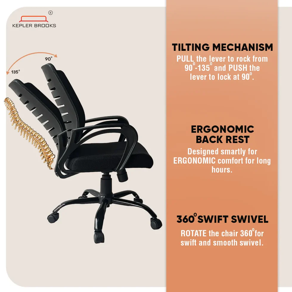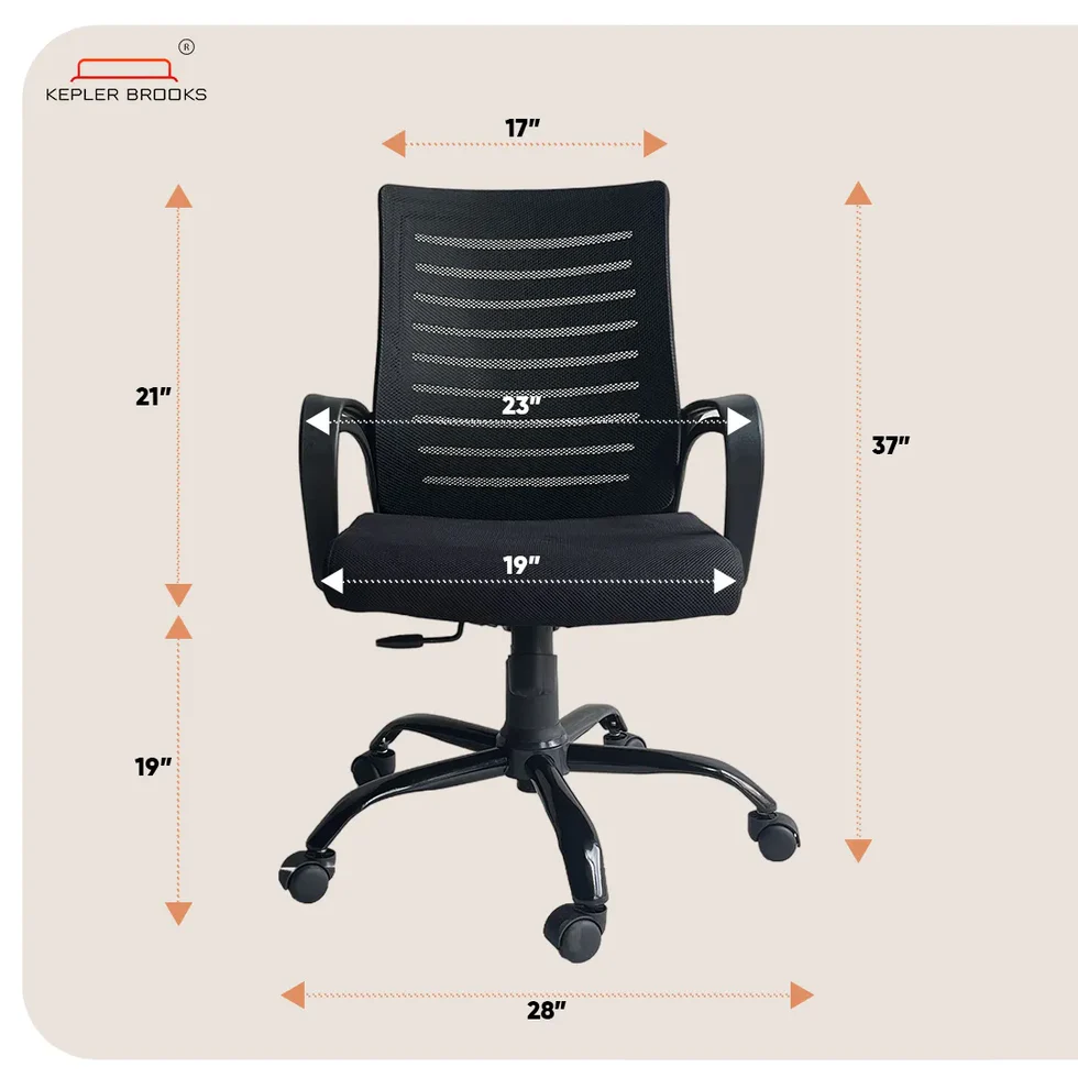 PRODUCT DETAILS – Seat Length (18.5 inches), Seat Width (18.5 inches), Seating Height (18 to 24 inches), Overall Height (36 inches) || Backrest frame material: Glass Filled Nylon | Upholstery cover: Breathable Mesh | Seat Upholstery: 45 D High-Density Moulded Foam | Colour: Black | Size: Mid Back || Powder Coated Metal Base