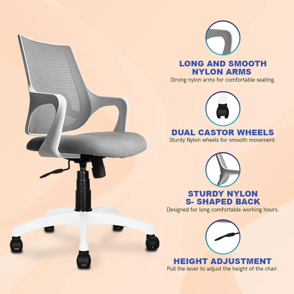 PRODUCT DIMENSIONS & DETAILS -Seat Length (48 CM), Seat Width (48 CM), Seating Height (18 to 24 inches), Overall Height (43-52 CM) || Backrest frame material: Glass Filled Nylon | Upholstery cover: Breathable Mesh | Seat Upholstery: 45 D High-Density Moulded Foam | Colour: White Grey | Size: Mid Back || Heavy Duty Nylon Base